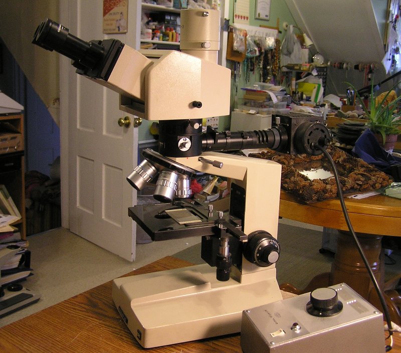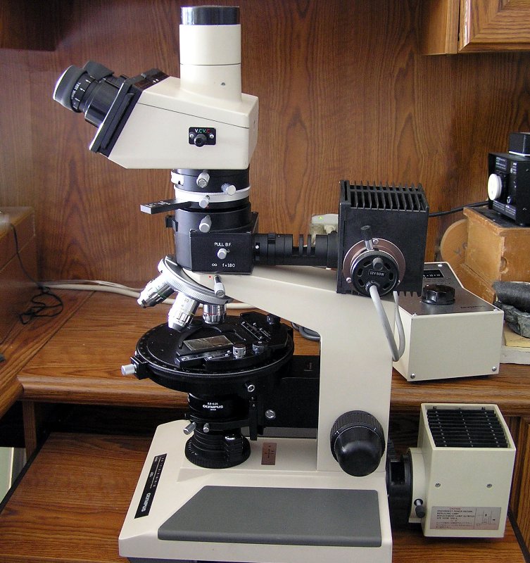 My personal BHSP with a reflecting light attachment, powered by a 50 watt lamp and TGH transformer. I usually use MSPlan objectives for both transmitted and reflected light observations in this system, and they are fine with the super-wide head as well.