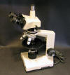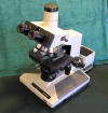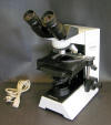 This newer BHM is based on the BH2-style stand and has big "neo" objectives, which are optimized for reflected light. The TF transformer puts out 30 watts, but 50 or 100 watt models are also available. This example has a very rare trinocular tilt-head. I use it for examining opaque "ore" minerals in rock sections.
