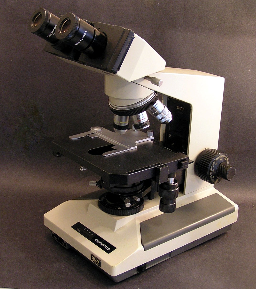 BH2 BHTU biological binocular microscope. Similar to the BHT except it has a non-removable nose turret that rotates the objectives inward, allowing more room over the stage for hands. I believe this version was intended to satisfy a preference of users in the U.S. clinical lab market.