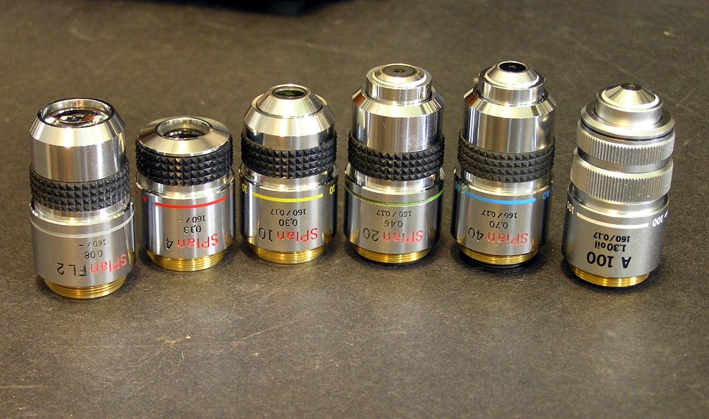 The large "Neo" objectives are optimized for reflected light, in DPlan and SPlan lines up to 150x. They require a turret with 25 mm holes.