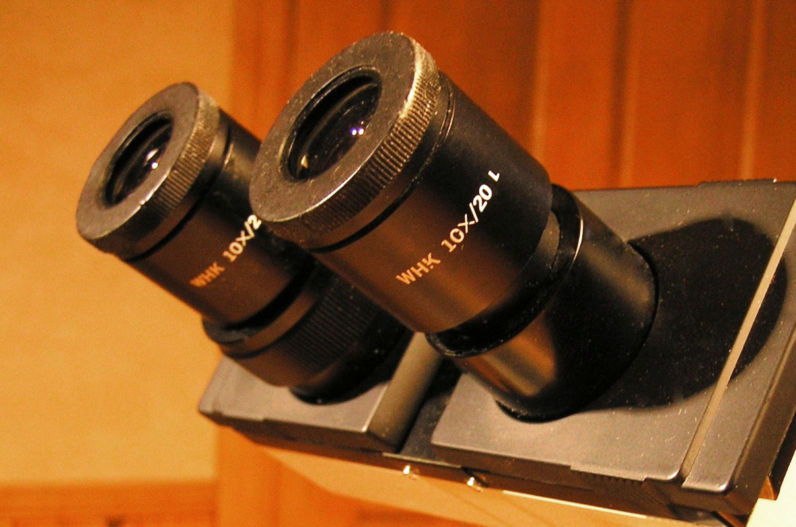The 30 mm diameter SWHK oculars are used with a super-wide BH2 head with FN 26.5. They all have helical diopter tops for individual focusing. The one on the right had a photo reticule that I replaced with a cross hair.