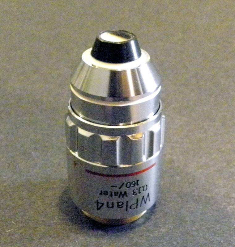 The Plan Water immersion objectives are very rare and expensive. This 4x is useful for watching little creatures swimming in a drop of water.